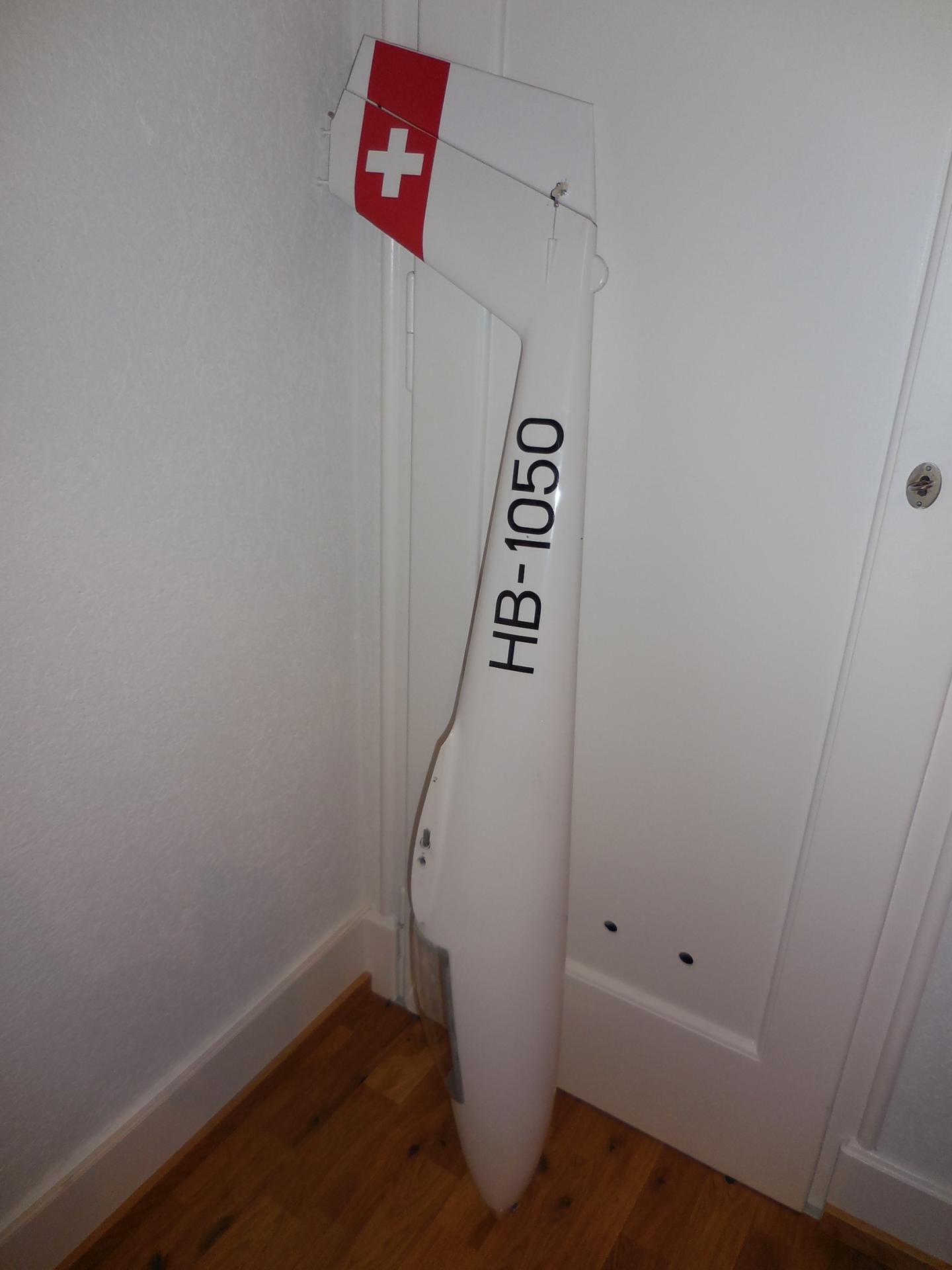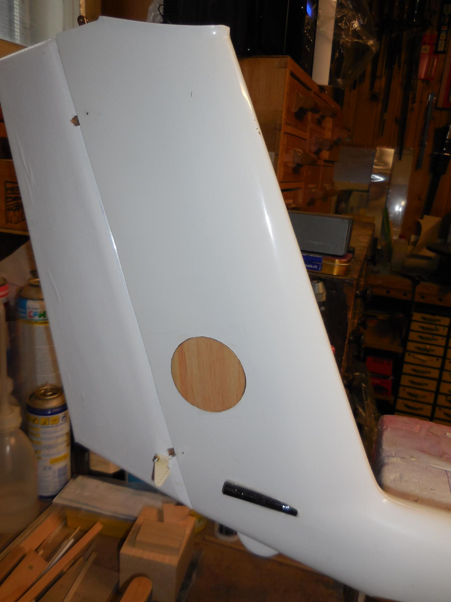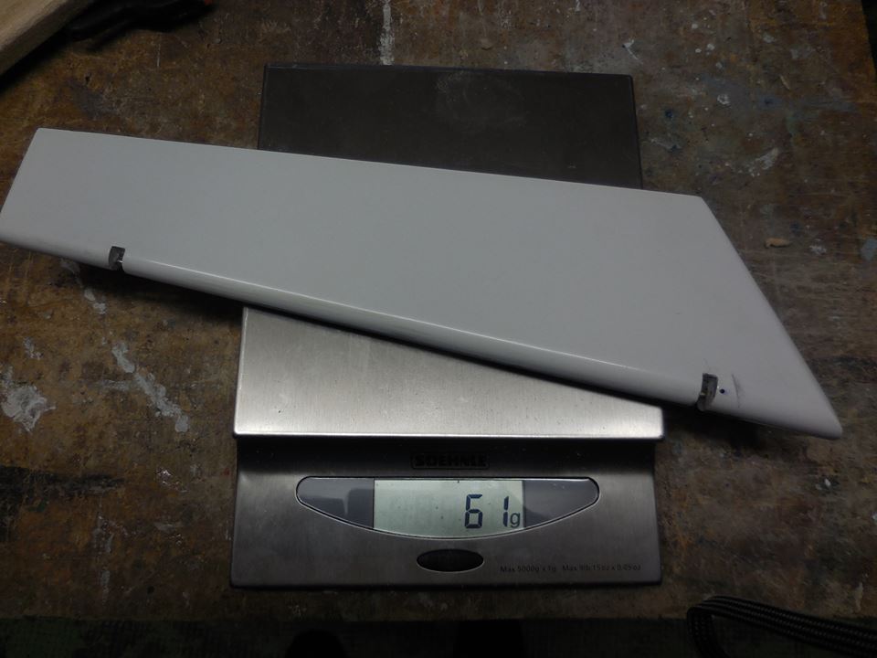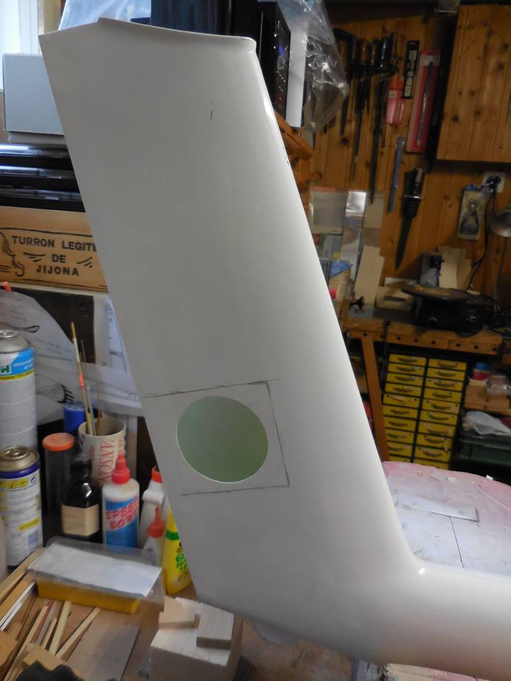 Une rapide analyse de la situation et et de la répartition des masses pour l'équillibrage du planeur montre que le poids nécessaire à l'avant est assez élevé, ce qui me conforte dans l'idée de remplacer une bonne partie de celui-ci par un moteur et des accus. Toutefois, il me semble judicieux de remplacer la partie mobile de la dérive d'origine, beaucoup trop lourde, par une dérive en structure, construite à l'ancienne, afin d'allèger un maximum l'arrière du planeur. Le sabilo lui à un poids raisonnable, ce qui ne nécessite pas de revoire sa conception. La commande de la gouverne de profondeur sur le stabilo se fera par l'intermédiaire d'un servo fixé dans la dérive. Une petite trappe de visite réalisée dans cette dérive permettra d'accèder facilement à ce servo si nécessaire. La commande du plan mobile de la dérive ( direction ) se fera par l'intermédiaire d'un cable aller retour relié à un servo situé à hauteur de la verrière.