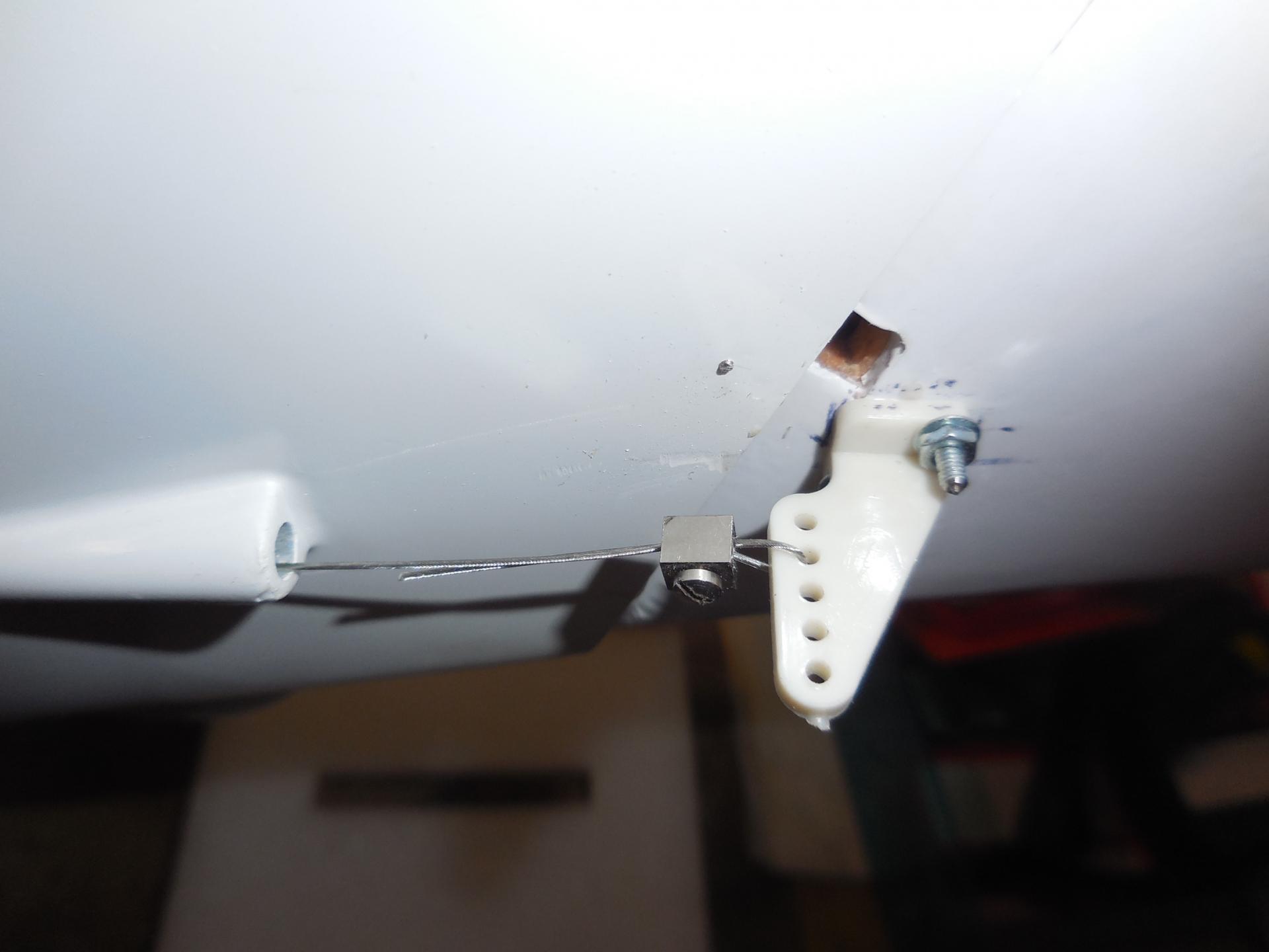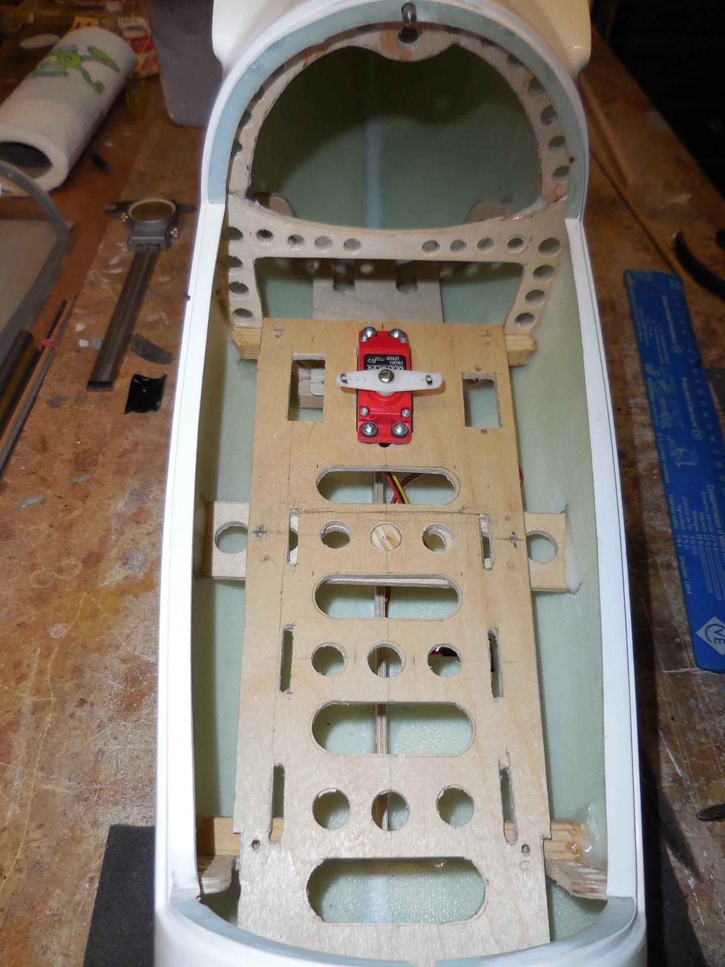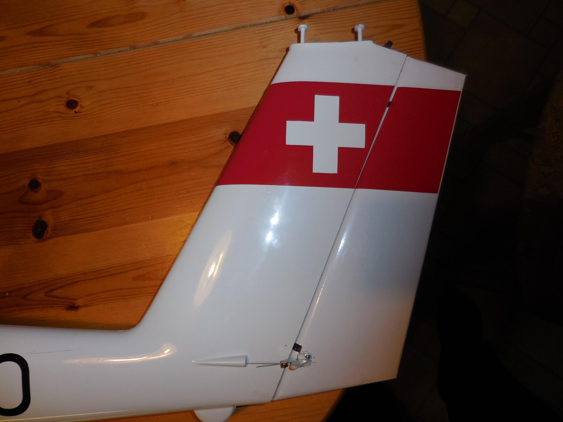 Une rapide analyse de la situation et et de la répartition des masses pour l'équillibrage du planeur montre que le poids nécessaire à l'avant est assez élevé, ce qui me conforte dans l'idée de remplacer une bonne partie de celui-ci par un moteur et des accus. Toutefois, il me semble judicieux de remplacer la partie mobile de la dérive d'origine, beaucoup trop lourde, par une dérive en structure, construite à l'ancienne, afin d'allèger un maximum l'arrière du planeur. Le sabilo lui à un poids raisonnable, ce qui ne nécessite pas de revoire sa conception. La commande de la gouverne de profondeur sur le stabilo se fera par l'intermédiaire d'un servo fixé dans la dérive. Une petite trappe de visite réalisée dans cette dérive permettra d'accèder facilement à ce servo si nécessaire. La commande du plan mobile de la dérive ( direction ) se fera par l'intermédiaire d'un cable aller retour relié à un servo situé à hauteur de la verrière.