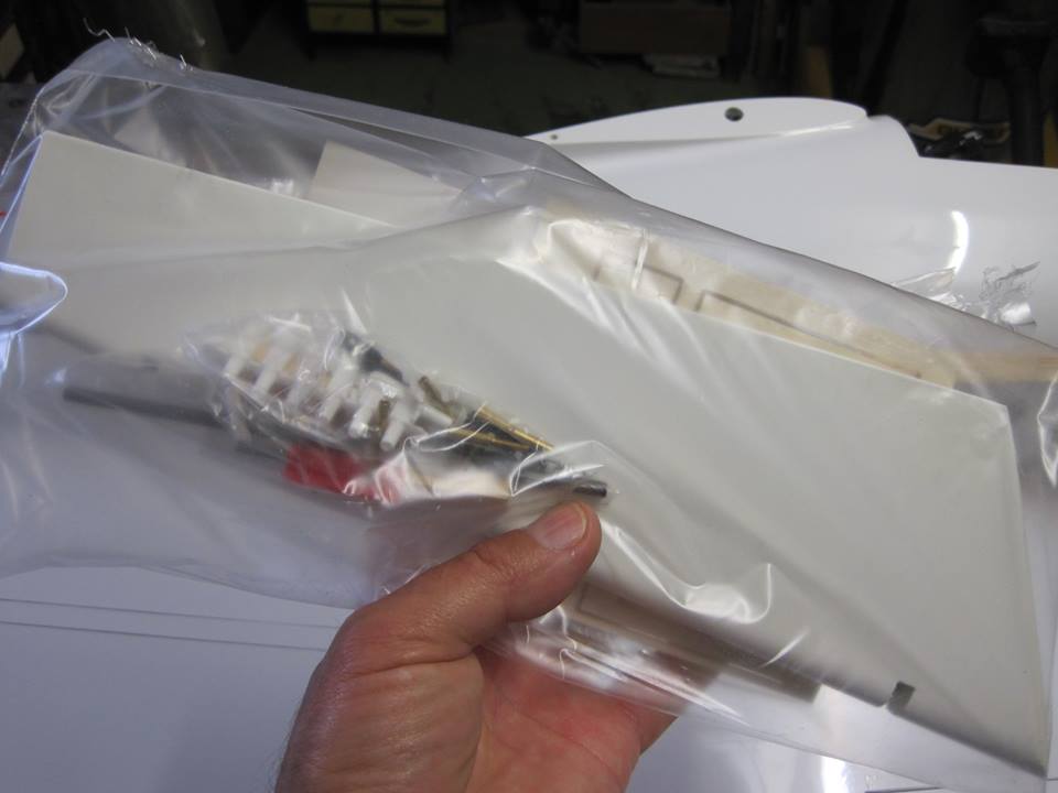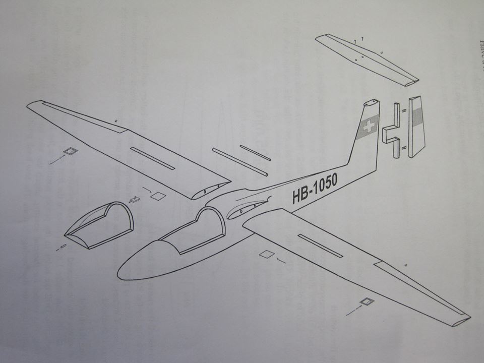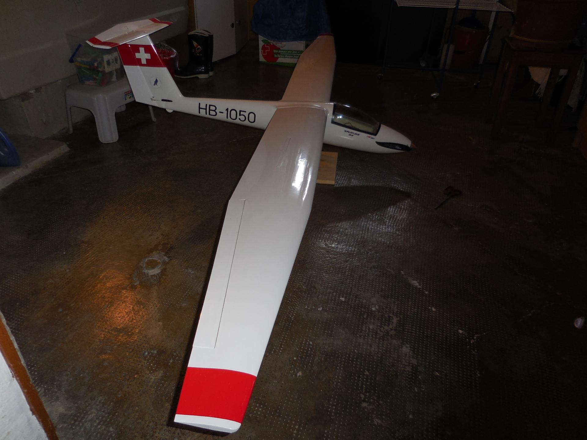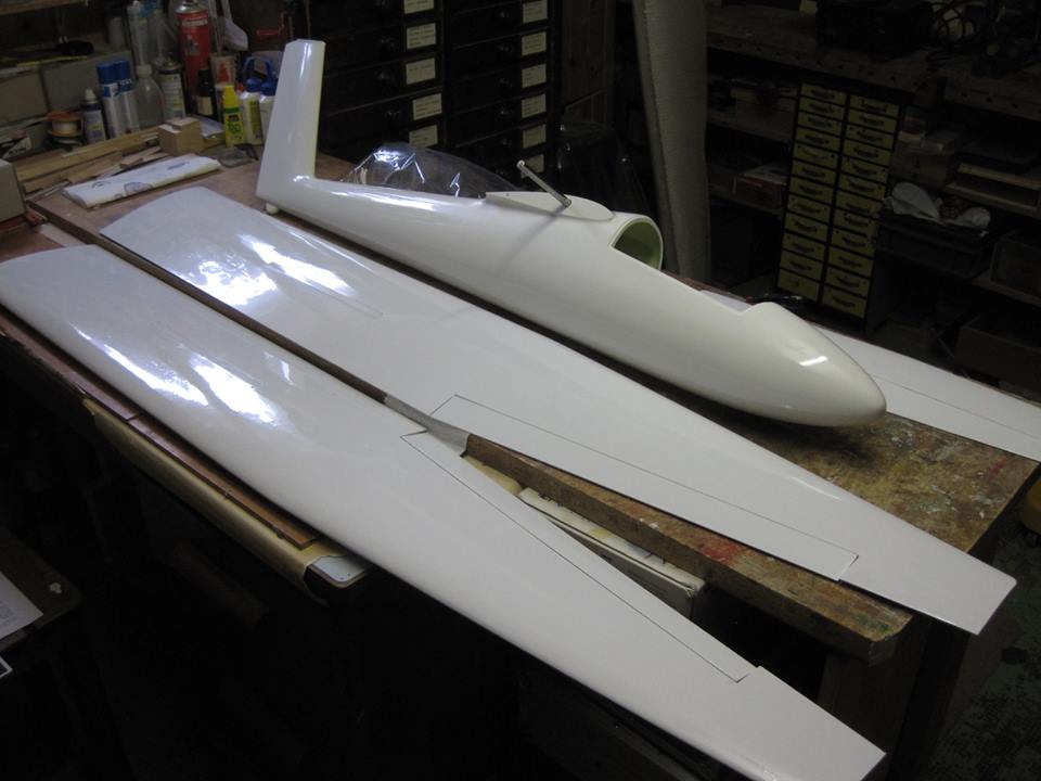 Mon choix c'est donc porté sur la fourniture disponible chez Royal-Model, à savoir un fuselage en fibre de verre reccouvert d'un gel-coat blanc, avec une dérive également en fibre. Une paire d'ailes en structure balsa coffrées et renforcée en fibre de carbone avec un stabilo de la même conception. Le tout est recouvert d'Oracover blanc. A noter que les aérofreins à lames sont déjà installés et que les emplacements pour les servos de commande des ailerons et des AF sont préparés.